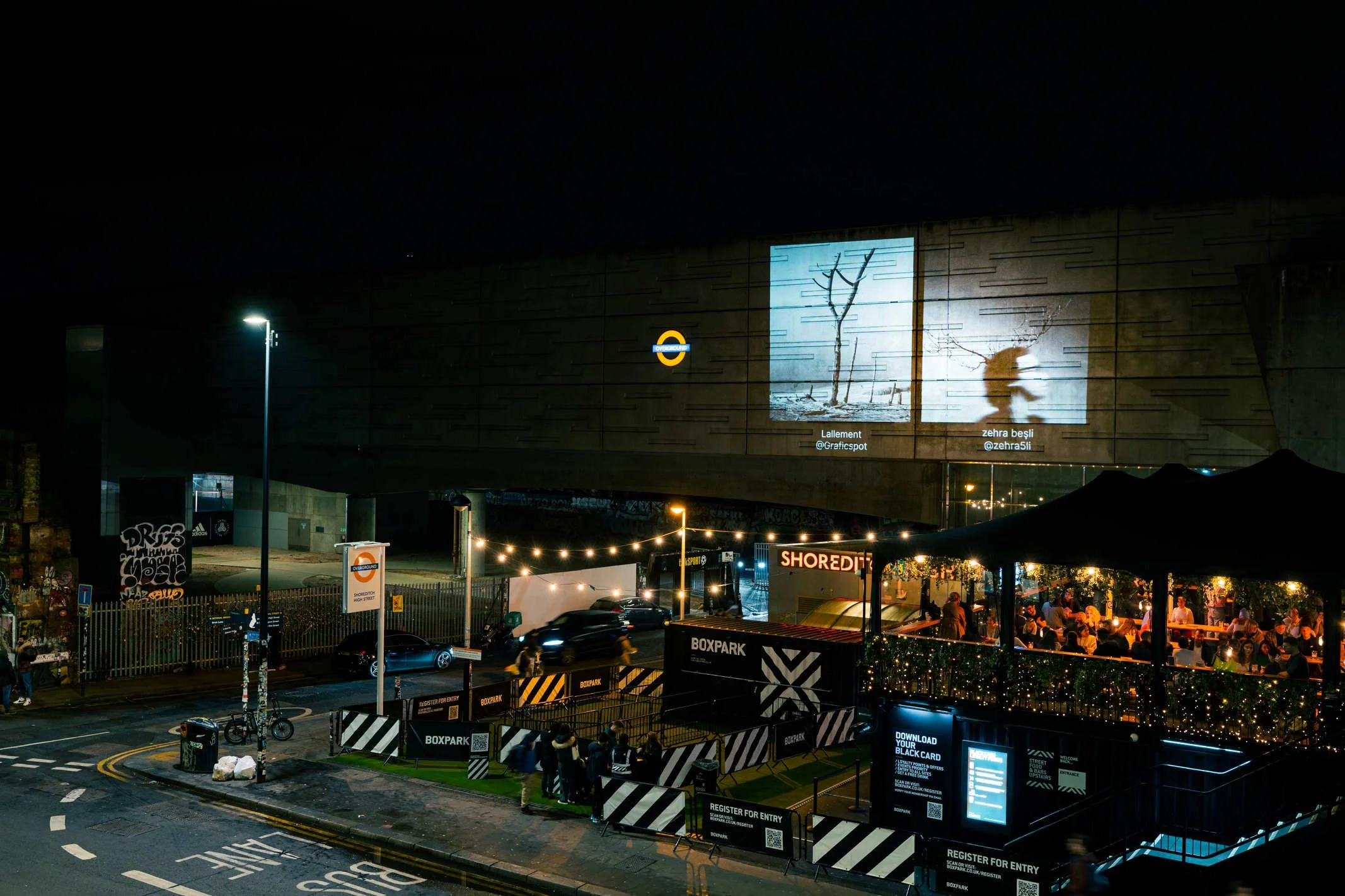 The photo "Slingshot" from the series "Around the Dune" was exhibited at the NFT London project 2022 and projected for ten days on the front of the London Underground station Shoreditch.